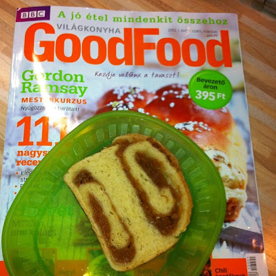 Rendszeresen olvasgatok gasztro blogokat, sokat főzök "fejben", tehát nem volt kérdés, hogy az első számot megveszem. Meglepő módon, nem csak nézegettem, hanem főztem is belőle. Először a lap címlapján ajánlott almás kalácsot. Igaz, a fonást idő hiányában elhagytam, de a feltekerés is, jól mutat, és finom is volt.